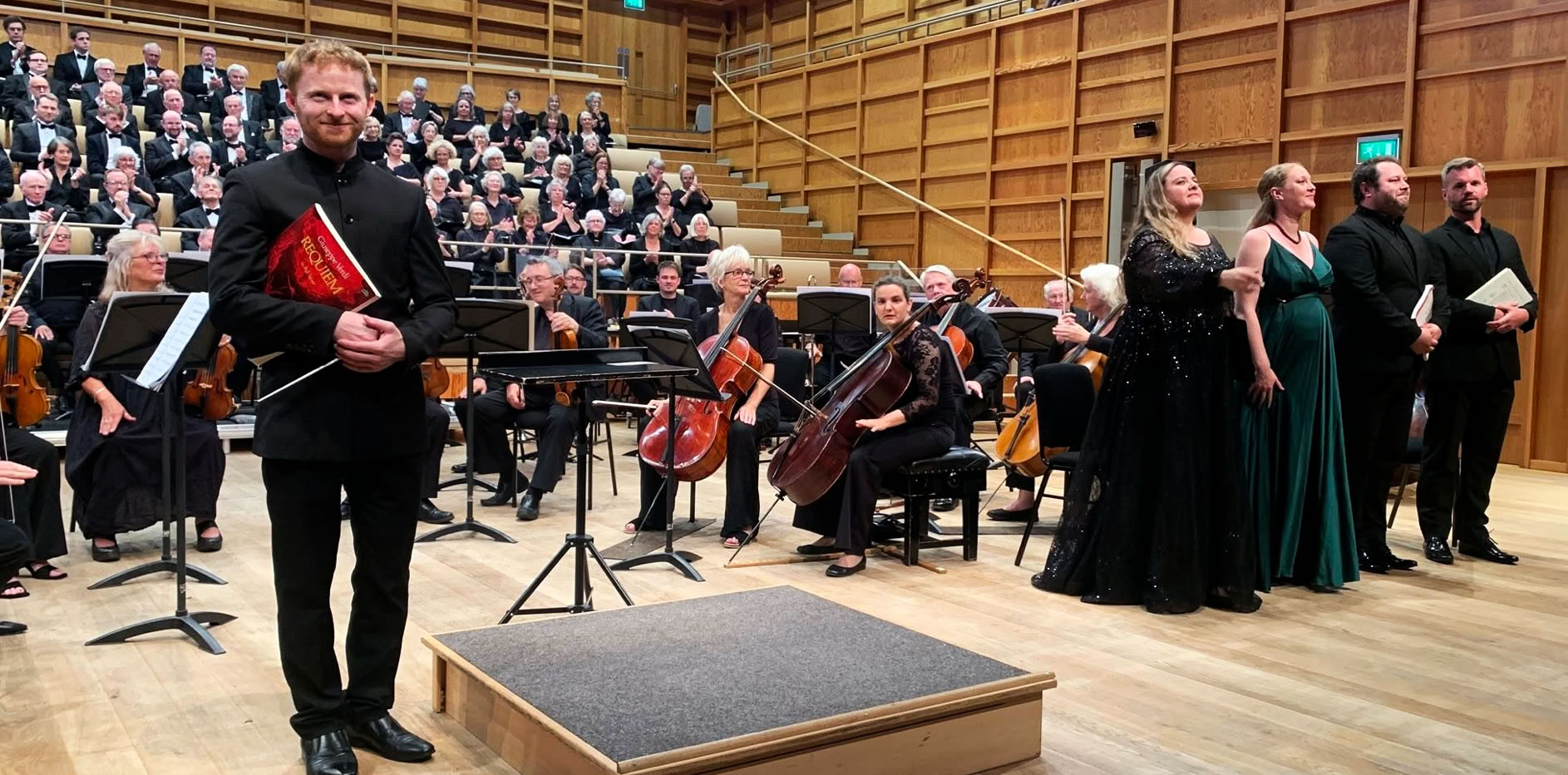 Our Music Director, Benedict Preece, and soloists Philippa Boyle (soprano), Bethany Horak-Hallett (mezzo-soprano), Peter Davoren (tenor) and Edward Grint (bass) take a bow after our performance of Verdi’s Requiem in the Colyer-Fergusson Hall, Universty of Kent, on 7th September 2025